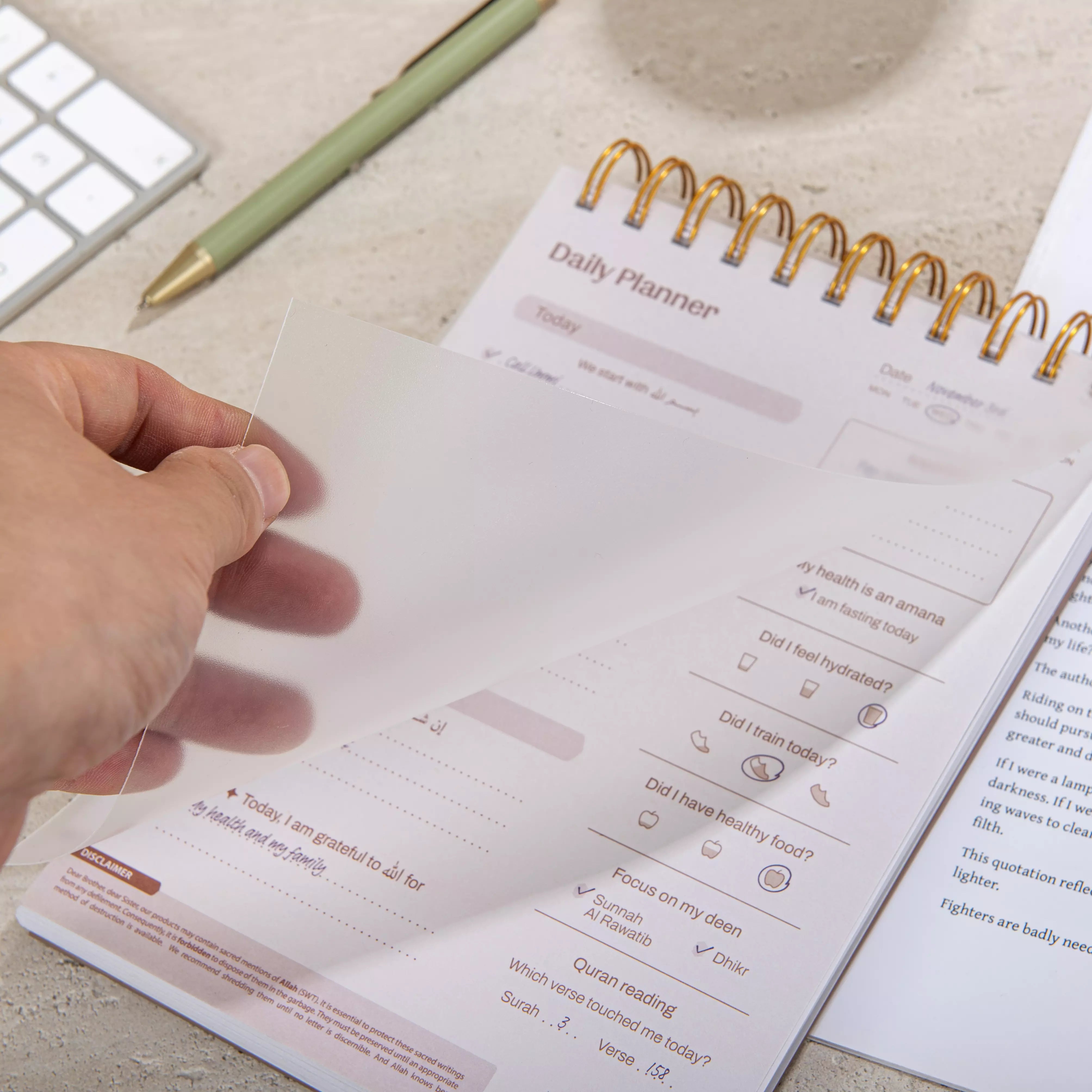 Pas à pas, cheminez vers plus de sagesse et d'introspection (muhasabah) en écrivant noir sur blanc pensées, rappels et versets.